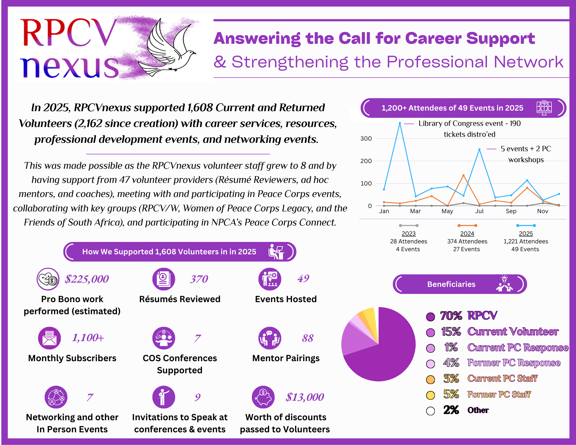The concept of RPCVnexus started in 2019 when Peace Corps and the National Peace Corps Association (NPCA) put out an ask for help in creating a program to support Peace Corps Volunteers seeking jobs after service. Since then, I’ve looked at the ‘how to’ and built RPCVnexus to provide post-service resources and career counseling to all Current and Returned Peace Corps Volunteers as they consider their next steps.