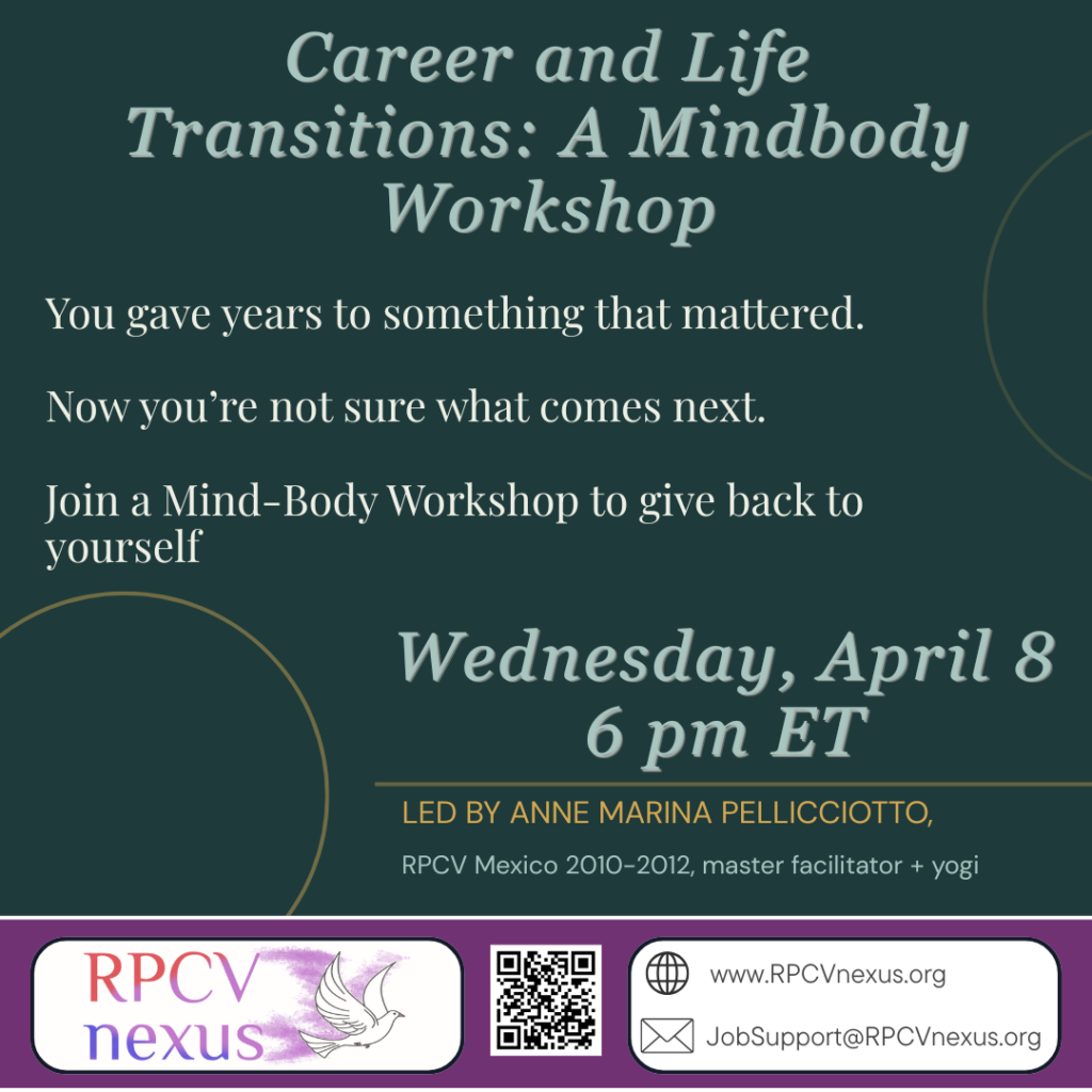 You gave years — maybe decades — to something that mattered. Now the ground has shifted beneath you. The loss isn’t just professional; it lives in your body. In this session with Marina Pellicciotto (RPCV Mexico), we’ll use simple yoga poses, breathwork, and freewriting to move from problem-solving mode to the deeper wisdom you carry in your body. We’ll make space for grief and dreaming – because people who chose a life of purpose once will find it again. Endings are invitations.