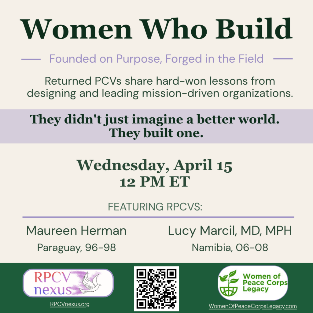 Starting something from nothing — especially across cultures and in underserved communities — takes more than a good idea. It takes grit, deep local knowledge, and a willingness to learn as you go. Join as Maureen Herman (RPCV Paraguay) and Lucy Marcil (RPCV Namibia) share hard-won lessons from founding and leading mission-driven organizations that create real, lasting change and what kept them going.