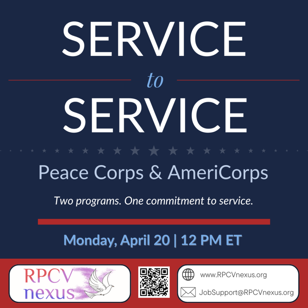 In this 60-minute session, we’ll hear from Volunteers who served in both programs including Gabe Jackson (RPCV Botswana & AmeriCorps San Antonio) and Meredith Meads (RPCV Albania & AmeriCorps Baltimore). Learn about recruitment, what the transition between them actually involves, and how to position your service experience — whether you’re just finishing up or thinking about what comes next.